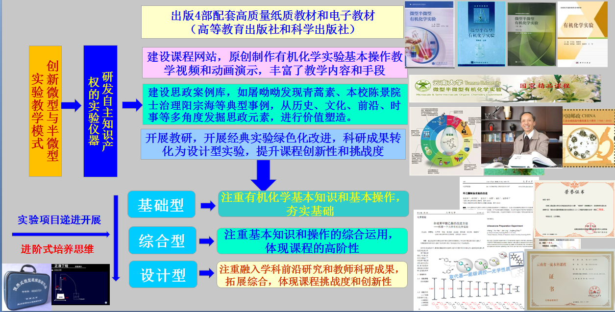 云南大学经过几代教育人的不懈努力,不断开拓、传承、创新,结合现代学科发展方向和高等教育发展实际,对《有机化学实验》这门课程所蕴含的科学精神不断传承。通过在有机化学实验中引入“绿色”“环保”“节约”“可持续发展”等教学理念,构建了微型与半微型实验教学模式;通过自主研发微型实验仪器,出版配套教材,形成了集教材建设、实验仪器建设、立体资源建设、教改研究、推广应用与辐射示范为一体的微型化教学模式和体系。相关课程获评“国家精品课程”“云南省一流本科课程”“云南大学课程思政示范课程”,课程团队的创新和实践也先后获得国家教学成果二等奖、云南省教学成果一等奖等荣誉。