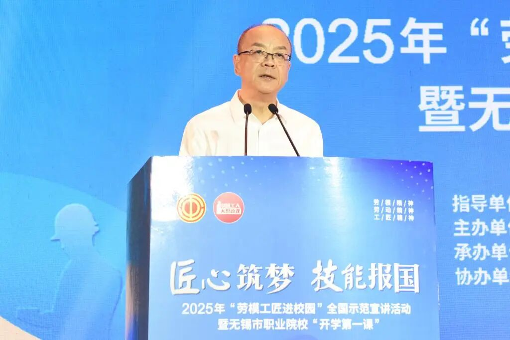 无锡市政协副主席、市总工会主席吴建元在致辞中指出,“劳模工匠进校园”是推进劳动教育与思政教育深度融合的重要举措,通过劳模工匠的亲身经历,引导青年学子坚定职业理想、锤炼技能本领,走好技能成才、技能报国之路。